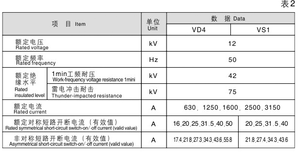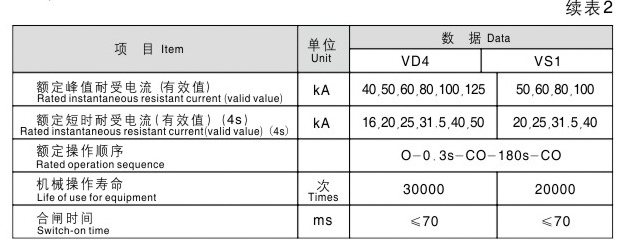 VD4、VS1真空断路器技术数据见表2