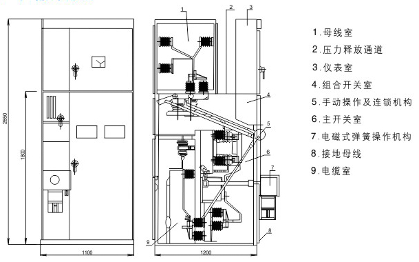 开关柜处于工作位置,即上下隔离开关,断路器处于合闸状态,前后门已锁好,并处于带电运行之中,这是的小手柄处于工作位置。先将断路器分闸后,再将小手柄扳倒“分断闭锁”位置,这时断路器不能合闸,将操作手柄插入下隔离的操作孔内从上往下拉,拉到隔离分闸位置,可先打开前门,取出门后边钥匙打开后门,停电操作完毕,检修人员对断路器室及电缆室进行维护和检修。